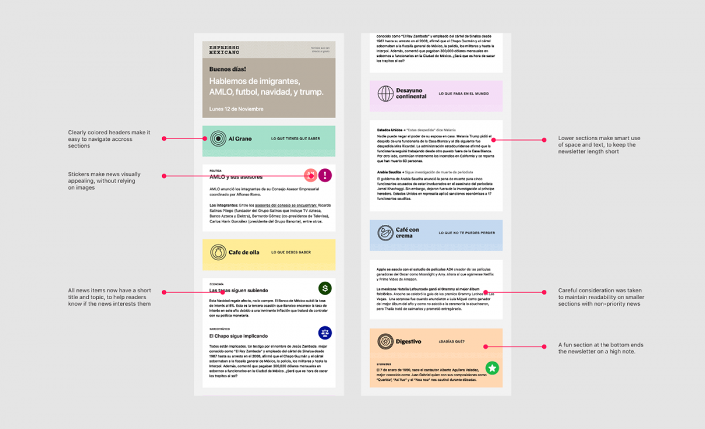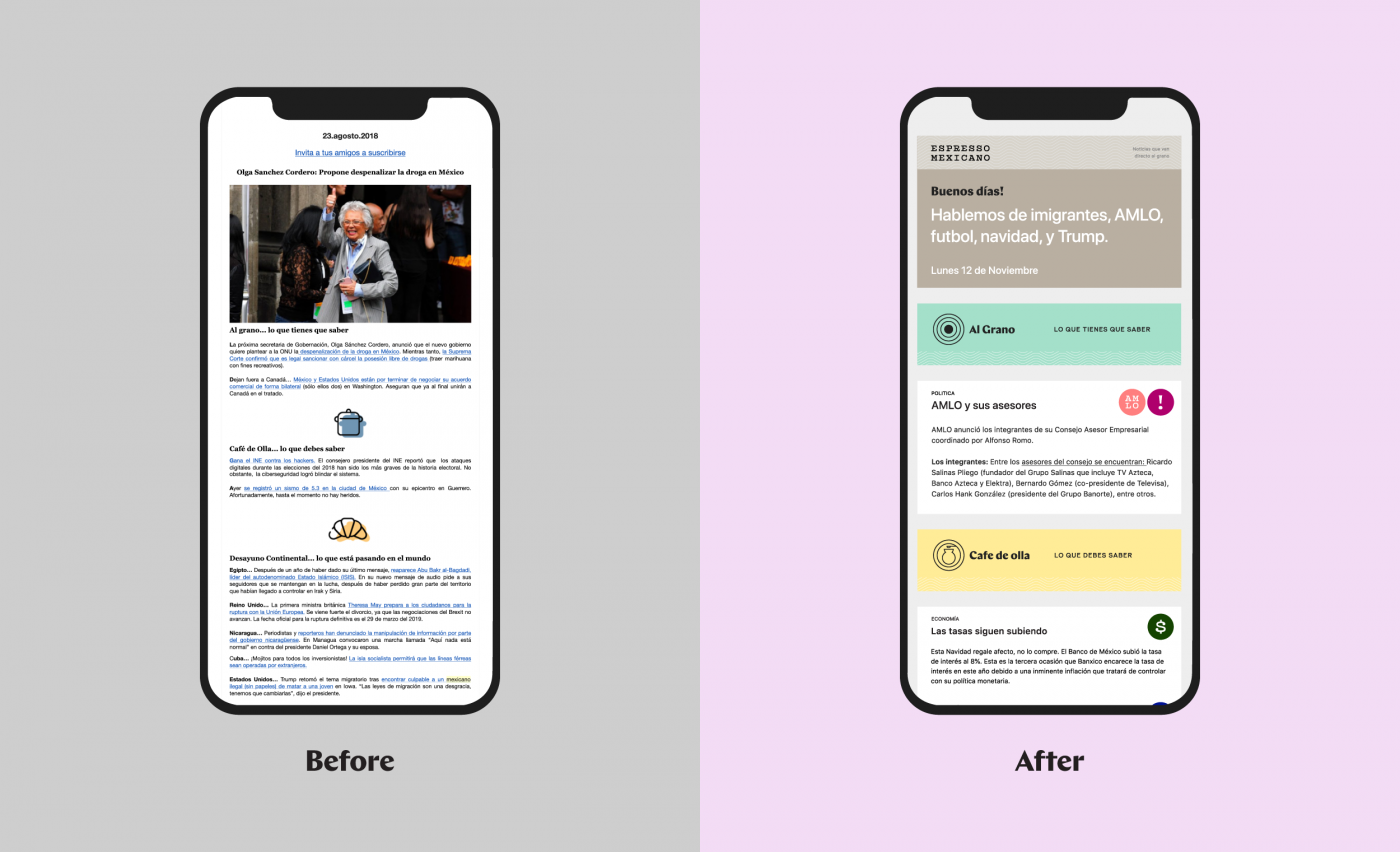 For the Espresso team, the design of the newsletter had to be flexible to adapt to the news of the day; and easy to build and use on a daily basis.