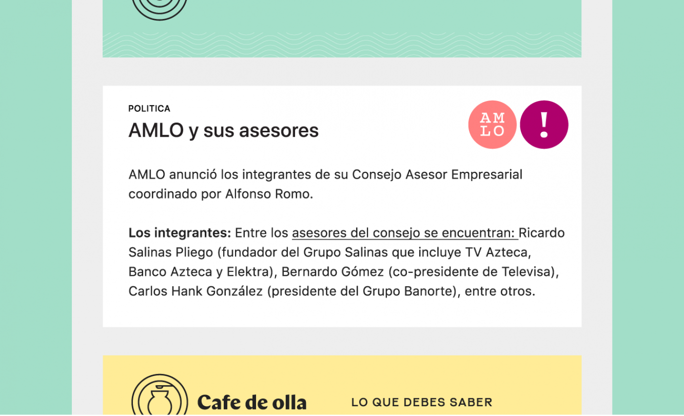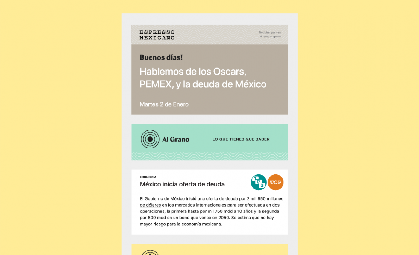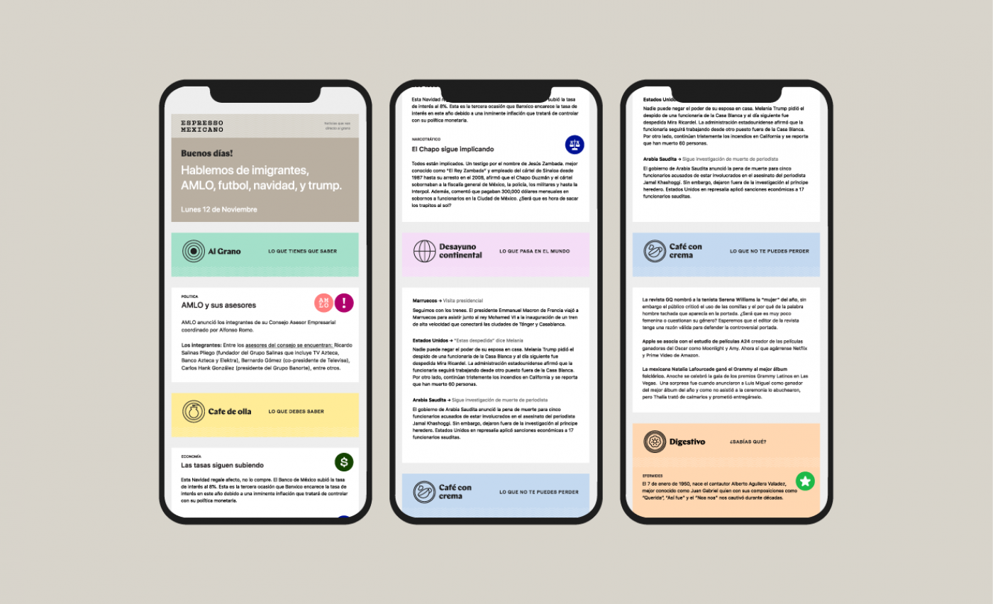 When designing the brand, our biggest challenge was finding a clever way to organize information. We had to create something useful for the Espresso Mexicano team and their readers.